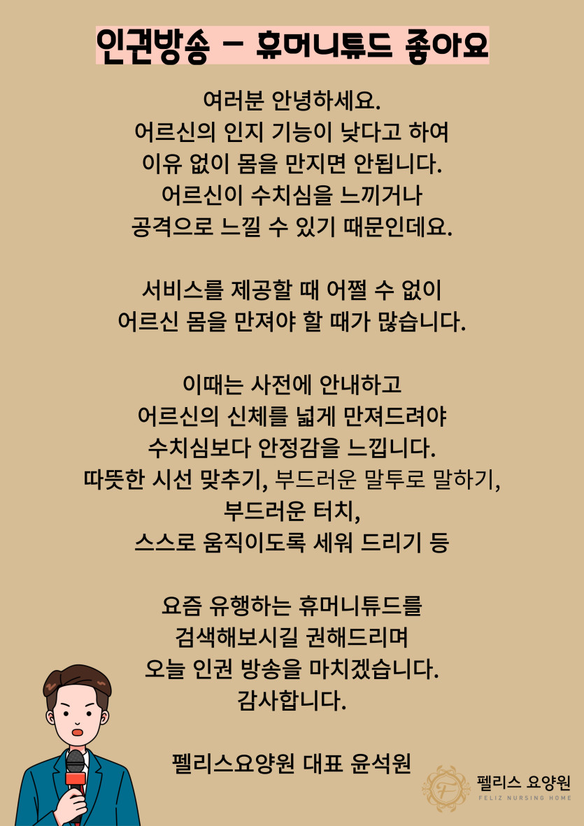 9월 셋째주 인권방송 - 휴머니튜드 좋아요 페이지 정보 작성자 관리자 댓글 0건 조회 29회 작성일 25-09-22 17:25 본문 9월 셋째주 인권방송 - 휴머니튜드 좋아요 글쓰기 글쓰기 목록 목록 이전글9월 넷째주 인권방송 - 큰 소리는 금물 25.09.22 다음글9월 둘째주 인권방송 - 가려주세요. 25.09.08
