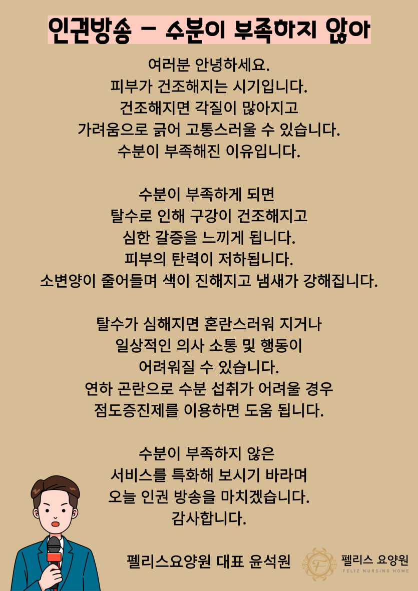 11월 첫째주 인권방송 - 수분이 부족하지 않아 페이지 정보 작성자 관리자 댓글 0건 조회 12회 작성일 25-11-10 17:52 본문 11월 첫째주 인권방송 - 수분이 부족하지 않아 글쓰기 글쓰기 목록 목록 이전글11월 둘째주 인권방송 - 세상을 넓혀주는 손 25.11.10 다음글10월 마지막주 인권방송 - 어르신의 자유 25.11.05