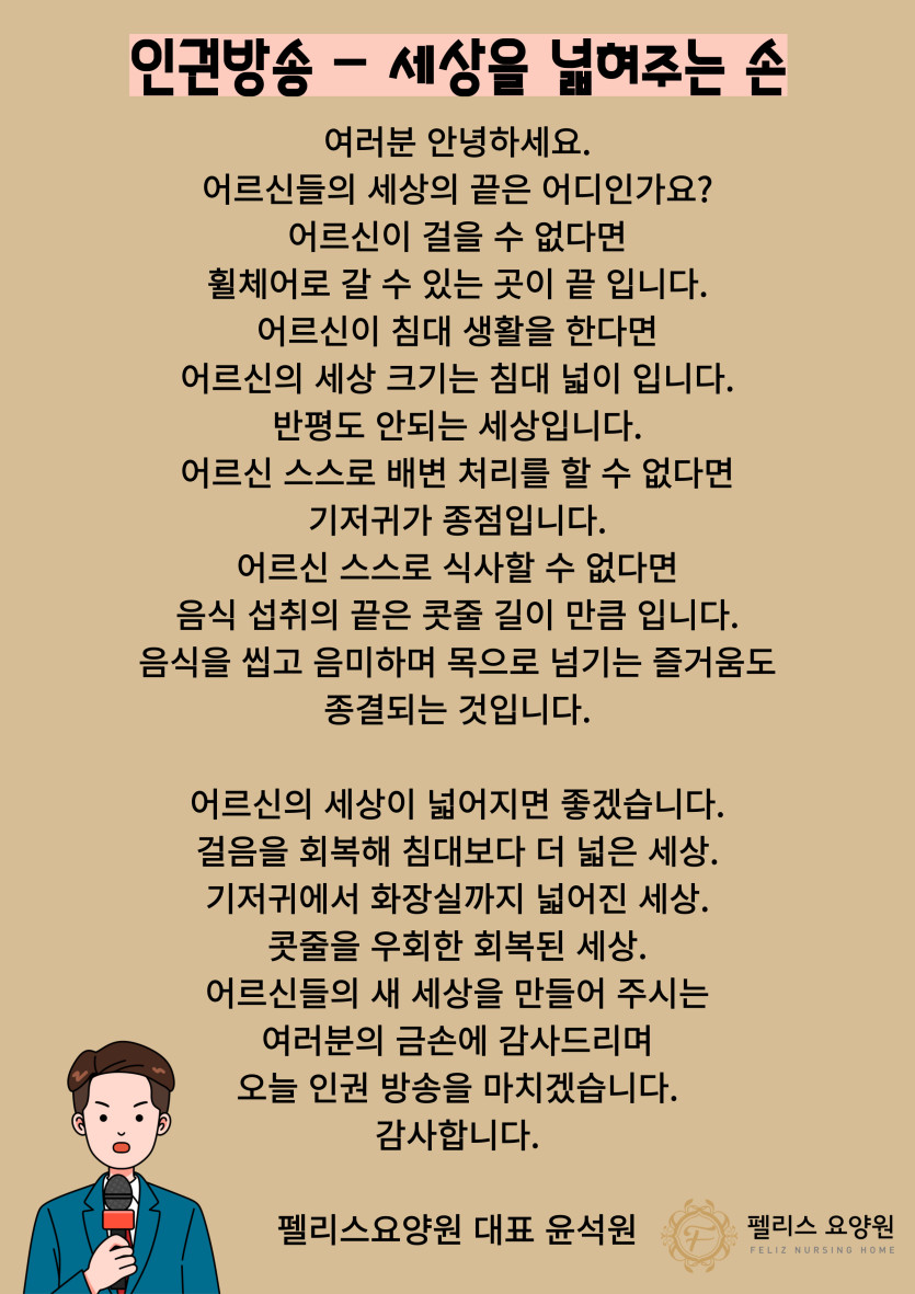 11월 둘째주 인권방송 - 세상을 넓혀주는 손 페이지 정보 작성자 관리자 댓글 0건 조회 15회 작성일 25-11-10 17:53 본문 11월 둘째주 인권방송 - 세상을 넓혀주는 손 글쓰기 글쓰기 목록 목록 이전글11월 셋째주 인권방송 - 목욕하는 날 25.12.05 다음글11월 첫째주 인권방송 - 수분이 부족하지 않아 25.11.10