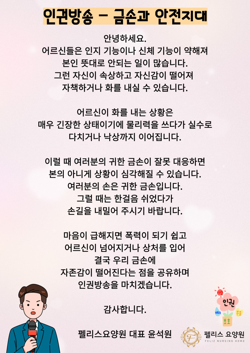 1월 둘째주 인권방송 - 금손과 안전지대 페이지 정보 작성자 관리자 댓글 0건 조회 5회 작성일 26-01-13 13:36 본문 1월 둘째주 인권방송 - 금손과 안전지대 글쓰기 글쓰기 목록 목록 이전글1월 셋째주 인권방송 - 빗장을 푸세요. 26.01.20 다음글1월 첫째주 인권방송 - 여러분이 보온병입니다. 26.01.05