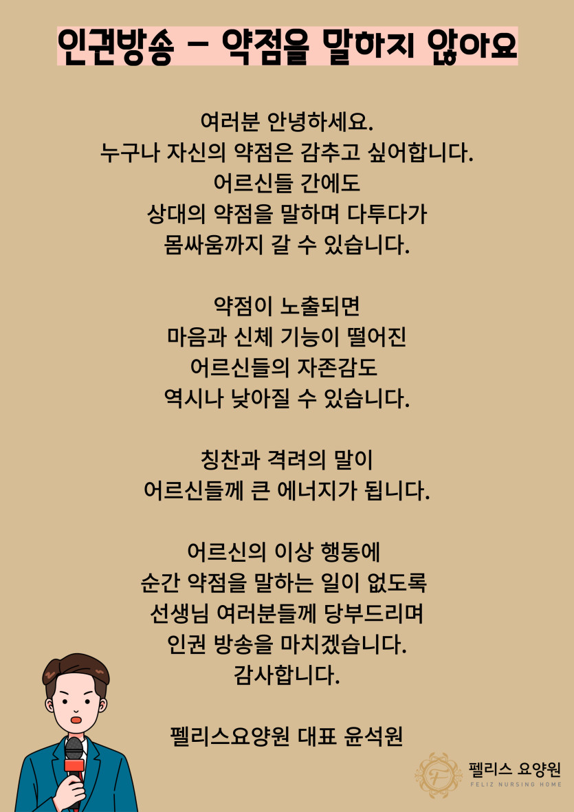 7월 셋째주 인권방송 - 약점을 말하지 않아요 페이지 정보 작성자 관리자 댓글 0건 조회 44회 작성일 25-07-21 14:58 본문 7월 셋째주 인권방송 - 약점을 말하지 않아요 글쓰기 글쓰기 목록 목록 이전글7월 넷째주 인권방송 - 선생님이 보청기입니다. 25.07.21 다음글펠리스요양원 유선 상담 안내 25.07.18