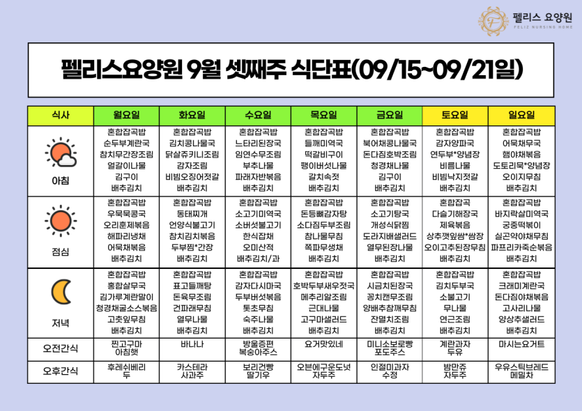 펠리스요양원 9월 셋째주 식단표 - 09/15~09/21 페이지 정보 작성자 관리자 댓글 0건 조회 33회 작성일 25-09-22 17:23 본문 펠리스요양원 9월 셋째주 식단표 - 09/15~09/21 목록 목록 이전글펠리스요양원 9월 넷째주 식단표 - 09/22~09/28 25.09.22 다음글펠리스요양원 9월 둘째주 식단표 - 09/08~09/14 25.09.08