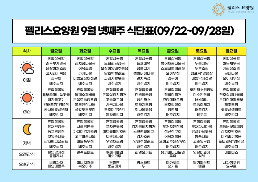 펠리스요양원 9월 넷째주 식단표 - 09/22~09/28 페이지 정보 작성자 관리자 댓글 0건 조회 43회 작성일 25-09-22 17:24 본문 펠리스요양원 9월 넷째주 식단표 - 09/22~09/28 목록 목록 이전글펠리스요양원 10월 첫째주 식단표 - 10/06~10/12 25.11.04 다음글펠리스요양원 9월 셋째주 식단표 - 09/15~09/21 25.09.22