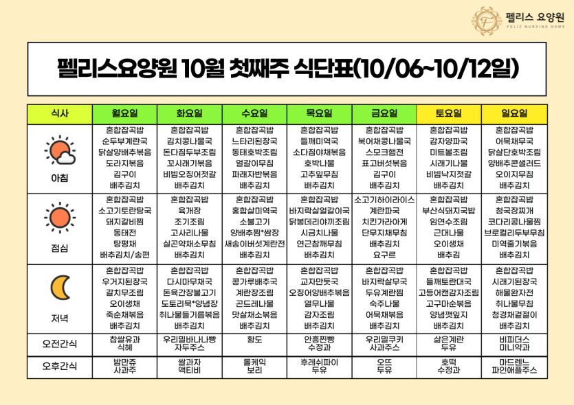 펠리스요양원 10월 첫째주 식단표 - 10/06~10/12 페이지 정보 작성자 관리자 댓글 0건 조회 23회 작성일 25-11-04 18:03 본문 펠리스요양원 10월 첫째주 식단표 - 10/06~10/12 목록 목록 이전글펠리스요양원 10월 둘째주 식단표 - 10/13~10/19 25.11.04 다음글펠리스요양원 9월 넷째주 식단표 - 09/22~09/28 25.09.22