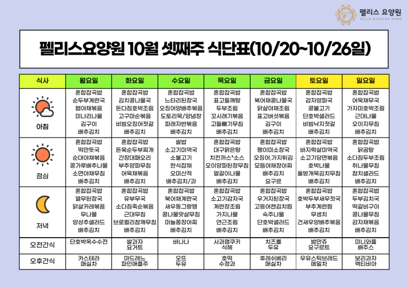 펠리스요양원 10월 셋째주 식단표 - 10/20~10/26 페이지 정보 작성자 관리자 댓글 0건 조회 17회 작성일 25-11-05 11:38 본문 펠리스요양원 10월 셋째주 식단표 - 10/20~10/26 목록 목록 이전글펠리스요양원 10월 마지막주 식단표 - 10/27~11/02 25.11.05 다음글펠리스요양원 10월 둘째주 식단표 - 10/13~10/19 25.11.04