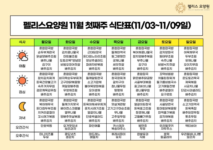 펠리스요양원 11월 첫째주 식단표 - 11/03~11/09 페이지 정보 작성자 관리자 댓글 0건 조회 17회 작성일 25-11-10 17:51 본문 펠리스요양원 11월 첫째주 식단표 - 11/03~11/09 목록 목록 이전글펠리스요양원 11월 둘째주 식단표 - 11/10~11/16 25.11.10 다음글펠리스요양원 10월 마지막주 식단표 - 10/27~11/02 25.11.05
