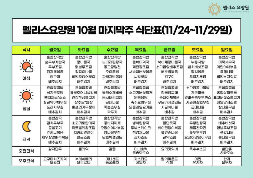 펠리스요양원 11월 마지막주 식단표 - 11/24~11/30 페이지 정보 작성자 관리자 댓글 0건 조회 13회 작성일 25-12-05 10:25 본문 펠리스요양원 11월 마지막주 식단표 - 11/24~11/30 목록 목록 이전글펠리스요양원 12월 첫째주 식단표 - 12/01~12/07 25.12.05 다음글펠리스요양원 11월 셋째주 식단표 - 11/17~11/23 25.12.05