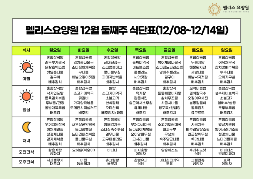 펠리스요양원 12월 둘째주 식단표 - 12/08~12/14 페이지 정보 작성자 관리자 댓글 0건 조회 1회 작성일 25-12-22 15:28 본문 펠리스요양원 12월 둘째주 식단표 - 12/08~12/14 목록 목록 이전글펠리스요양원 12월 셋째주 식단표 - 12/15~12/21 25.12.22 다음글펠리스요양원 12월 첫째주 식단표 - 12/01~12/07 25.12.05