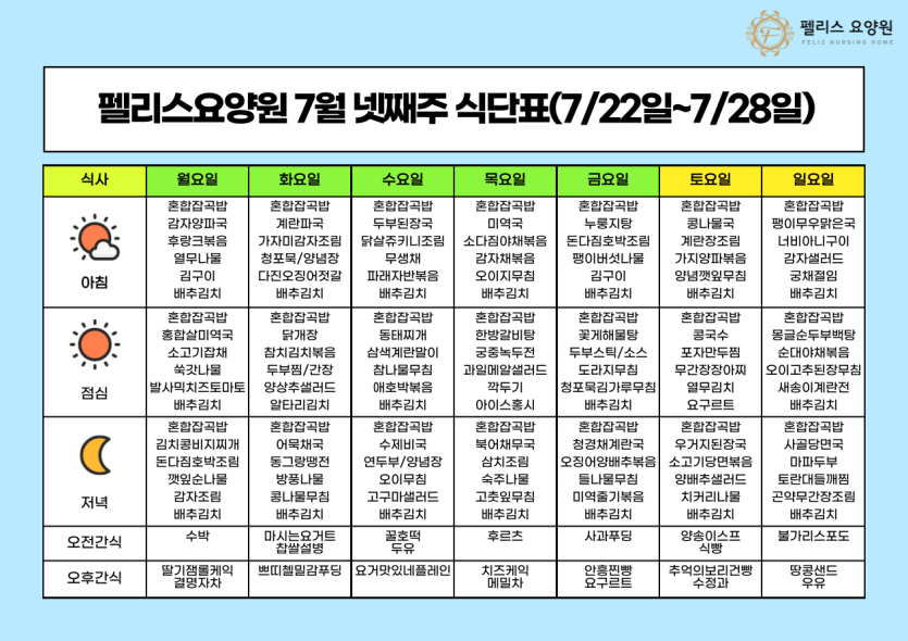 펠리스요양원 7월 셋째주 식단표 - 7/22~7/28 페이지 정보 작성자 관리자 댓글 0건 조회 91회 작성일 24-07-23 08:56 본문 펠리스요양원 7월 셋째주 식단표 - 7/22~7/28 목록 목록 이전글펠리스요양원 7월 마지막주 식단표 - 7/29~7/31 24.07.31 다음글펠리스요양원 7월 셋째주 식단표 - 7/15~7/21 24.07.19