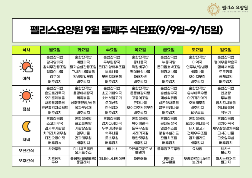 펠리스요양원 9월 둘째주 식단표 - 9/9~9/15 페이지 정보 작성자 관리자 댓글 0건 조회 83회 작성일 24-09-11 16:32 본문 펠리스요양원 9월 둘째주 식단표 - 9/9~9/15 목록 목록 이전글펠리스요양원 9월 넷째주 식단표 - 9/23~9/29 24.09.23 다음글펠리스요양원 9월 첫째주 식단표 - 9/2~9/8 24.09.02