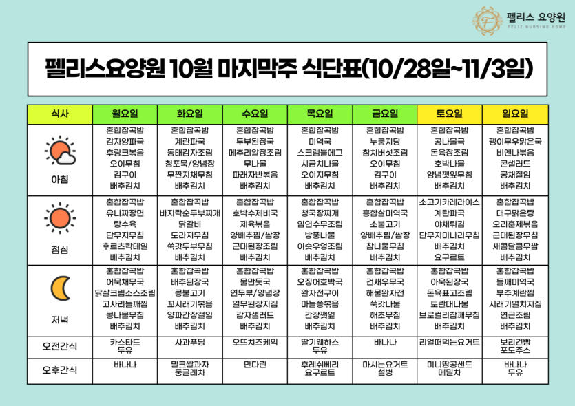 펠리스요양원 10월 마지막주 식단표 - 10/28~11/3 페이지 정보 작성자 관리자 댓글 0건 조회 72회 작성일 24-10-28 11:55 본문 펠리스요양원 10월 마지막주 식단표 - 10/28~11/3 목록 목록 이전글펠리스요양원 11월 첫째주 식단표 - 11/4~11/10 24.11.04 다음글펠리스요양원 10월 넷째주 식단표 - 10/21~10/27 24.10.22
