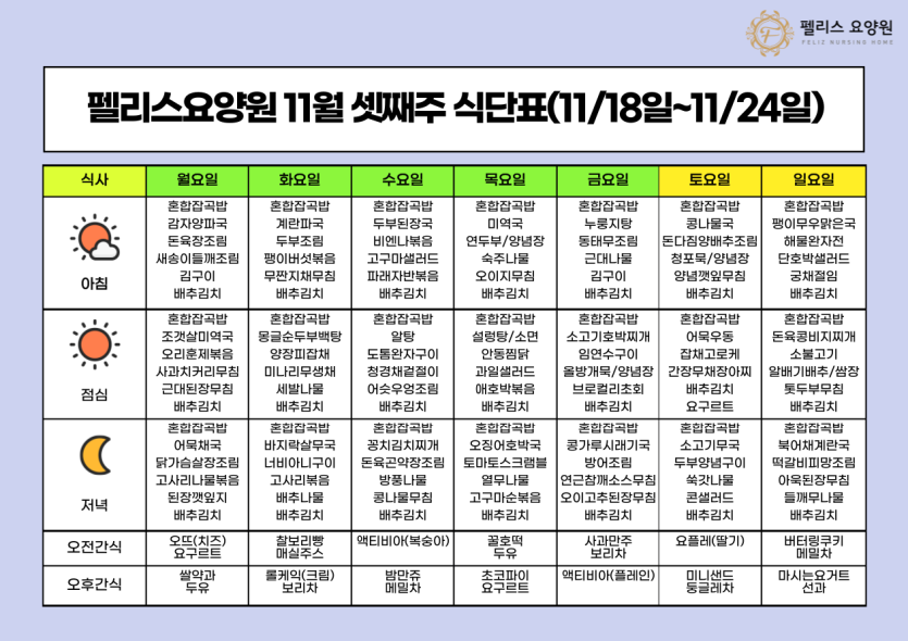 펠리스요양원 11월 셋째주 식단표 - 11/18~11/24 페이지 정보 작성자 관리자 댓글 0건 조회 78회 작성일 24-11-18 15:13 본문 펠리스요양원 11월 셋째주 식단표 - 11/18~11/24 목록 목록 이전글펠리스요양원 11월 마지막주 식단표 - 11/25~11/30 24.11.25 다음글펠리스요양원 11월 첫째주 식단표 - 11/4~11/10 24.11.04
