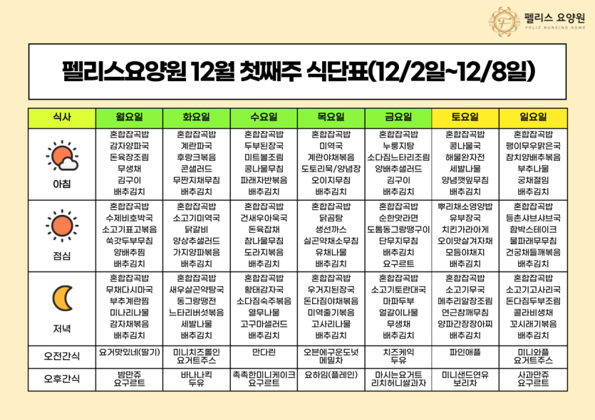펠리스요양원 12월 첫째주 식단표 - 12/02~12/08 페이지 정보 작성자 관리자 댓글 0건 조회 82회 작성일 24-12-02 15:46 본문 펠리스요양원 12월 첫째주 식단표 - 12/02~12/08 목록 목록 이전글펠리스요양원 12월 둘째주 식단표 - 12/9~12/15 24.12.06 다음글펠리스요양원 11월 마지막주 식단표 - 11/25~11/30 24.11.25