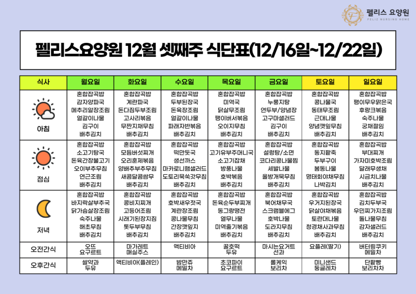 펠리스요양원 12월 셋째주 식단표 - 12/16~12/22 페이지 정보 작성자 관리자 댓글 0건 조회 90회 작성일 24-12-16 17:16 본문 펠리스요양원 12월 셋째주 식단표 - 12/16~12/22 목록 목록 이전글펠리스요양원 12월 넷째주 식단표 - 12/23~12/29 24.12.23 다음글펠리스요양원 12월 둘째주 식단표 - 12/9~12/15 24.12.06