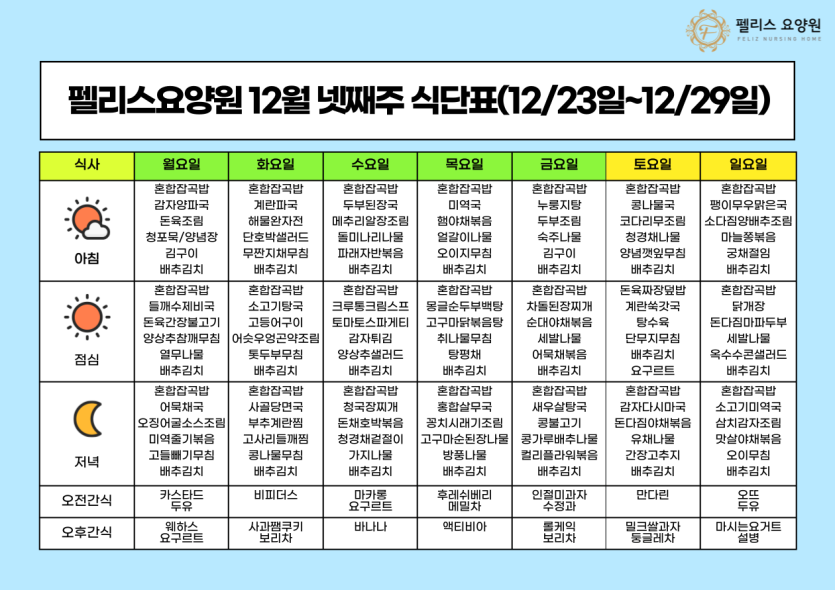 펠리스요양원 12월 넷째주 식단표 - 12/23~12/29 페이지 정보 작성자 관리자 댓글 0건 조회 88회 작성일 24-12-23 13:14 본문 펠리스요양원 12월 넷째주 식단표 - 12/23~12/29 목록 목록 이전글펠리스요양원 12월 마지막주 식단표 - 12/30~01/05 24.12.30 다음글펠리스요양원 12월 셋째주 식단표 - 12/16~12/22 24.12.16
