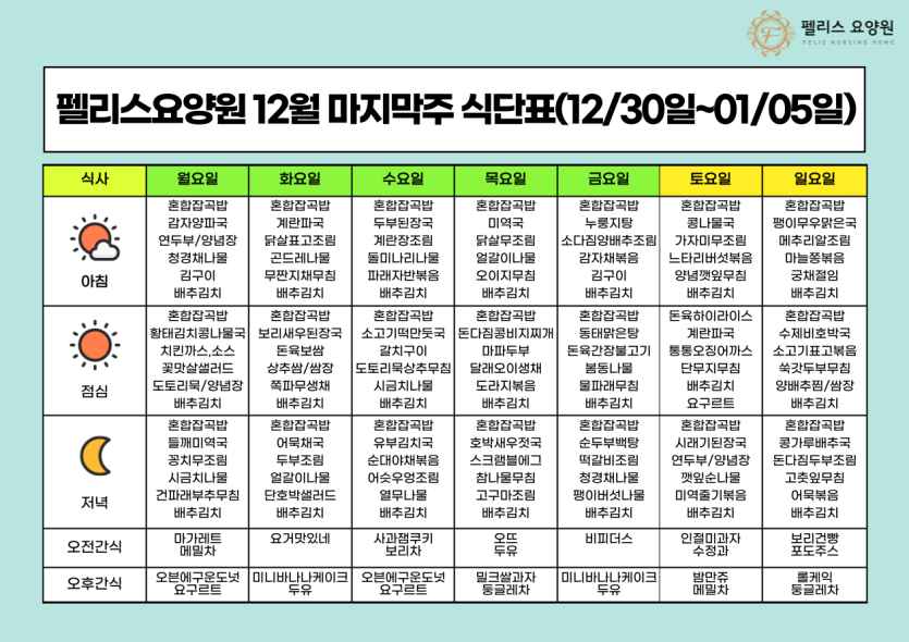 펠리스요양원 12월 마지막주 식단표 - 12/30~01/05 페이지 정보 작성자 관리자 댓글 0건 조회 95회 작성일 24-12-30 11:43 본문 펠리스요양원 12월 마지막주 식단표 - 12/30~01/05 목록 목록 이전글펠리스요양원 1월 첫째주 식단표 - 01/06~01/12 25.01.06 다음글펠리스요양원 12월 넷째주 식단표 - 12/23~12/29 24.12.23