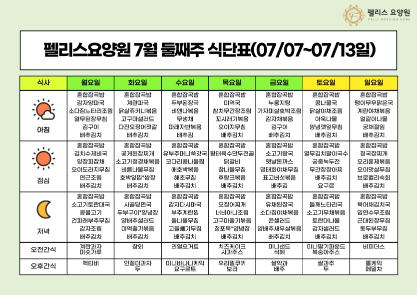 펠리스요양원 7월 둘째주 식단표 - 07/07~07/13 페이지 정보 작성자 관리자 댓글 0건 조회 38회 작성일 25-07-07 10:15 본문 펠리스요양원 7월 둘째주 식단표 - 07/07~07/13 목록 목록 이전글펠리스요양원 7월 셋째주 식단표 - 07/14~07/20 25.07.21 다음글펠리스요양원 7월 첫째주 식단표 - 06/30~07/06 25.06.30