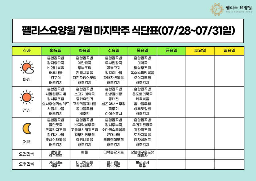 펠리스요양원 7월 마지막주 식단표 - 07/28~07/31 페이지 정보 작성자 관리자 댓글 0건 조회 38회 작성일 25-07-28 14:47 본문 펠리스요양원 7월 마지막주 식단표 - 07/28~07/31 목록 목록 이전글펠리스요양원 8월 첫째주 식단표 - 08/04~08/10 25.08.06 다음글펠리스요양원 7월 넷째주 식단표 - 07/21~07/27 25.07.21