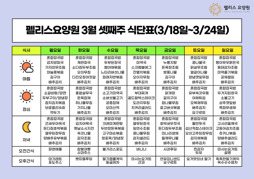펠리스요양원 3월 셋째주 식단표 - 3/18~3/24 페이지 정보 작성자 관리자 댓글 0건 조회 75회 작성일 24-03-18 11:46 본문 펠리스요양원 3월 셋째주 식단표 - 3/18~3/24 목록 목록 이전글펠리스요양원 3월 넷째주 식단표 - 3/25~3/31 24.03.25 다음글펠리스요양원 3월 둘째주 식단표 - 3/11~3/17 24.03.12