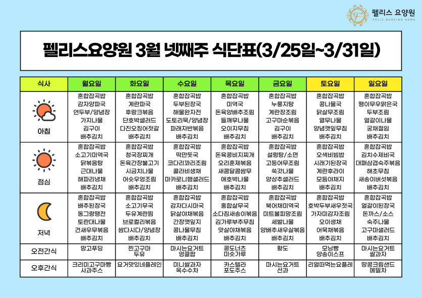 펠리스요양원 3월 넷째주 식단표 - 3/25~3/31 페이지 정보 작성자 관리자 댓글 0건 조회 75회 작성일 24-03-25 09:49 본문 펠리스요양원 3월 넷째주 식단표 - 3/25~3/31 목록 목록 이전글펠리스요양원 4월 첫째주 식단표 - 4/1~4/7 24.03.29 다음글펠리스요양원 3월 셋째주 식단표 - 3/18~3/24 24.03.18