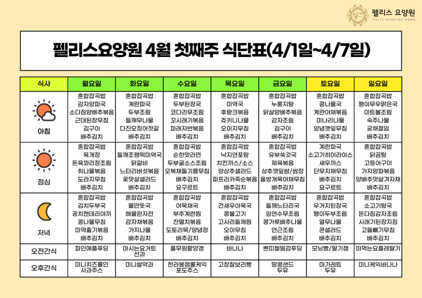 펠리스요양원 4월 첫째주 식단표 - 4/1~4/7 페이지 정보 작성자 관리자 댓글 0건 조회 79회 작성일 24-03-29 15:15 본문 펠리스요양원 4월 첫째주 식단표 - 4/1~4/7 목록 목록 이전글펠리스요양원 4월 둘째주 식단표 - 4/8~4/14 24.04.08 다음글펠리스요양원 3월 넷째주 식단표 - 3/25~3/31 24.03.25