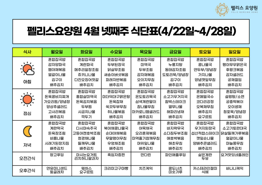 펠리스요양원 4월 넷째주 식단표 - 4/22~4/28 페이지 정보 작성자 관리자 댓글 0건 조회 74회 작성일 24-04-22 14:18 본문 펠리스요양원 4월 넷째주 식단표 - 4/22~4/28 목록 목록 이전글펠리스요양원 5월 첫째주 식단표 - 4/29~5/5 24.04.29 다음글펠리스요양원 4월 셋째주 식단표 - 4/15~4/21 24.04.19
