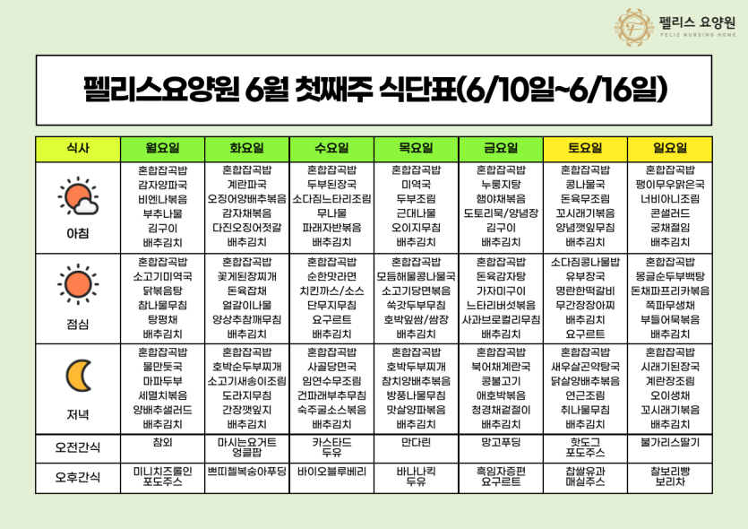 펠리스요양원 6월 둘째주 식단표 - 6/10~6/16 페이지 정보 작성자 관리자 댓글 0건 조회 83회 작성일 24-06-10 09:53 본문 펠리스요양원 6월 둘째주 식단표 - 6/10~6/16 목록 목록 이전글펠리스요양원 6월 셋째주 식단표 - 6/17~6/23 24.06.18 다음글펠리스요양원 맛있는 간식 5월 편 24.06.03