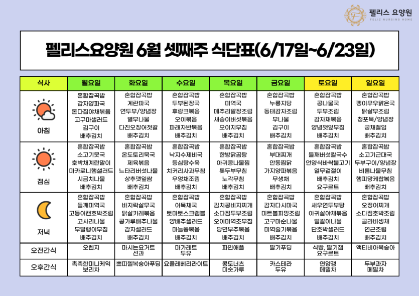 펠리스요양원 6월 셋째주 식단표 - 6/17~6/23 페이지 정보 작성자 관리자 댓글 0건 조회 85회 작성일 24-06-18 14:03 본문 펠리스요양원 6월 셋째주 식단표 - 6/17~6/23 목록 목록 이전글펠리스요양원 6월 마지막주 식단표 - 6/24~6/30 24.06.24 다음글펠리스요양원 6월 둘째주 식단표 - 6/10~6/16 24.06.10