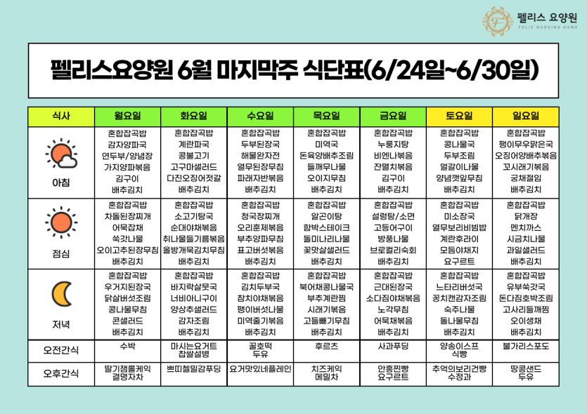 펠리스요양원 6월 마지막주 식단표 - 6/24~6/30 페이지 정보 작성자 관리자 댓글 0건 조회 88회 작성일 24-06-24 14:07 본문 펠리스요양원 6월 마지막주 식단표 - 6/24~6/30 목록 목록 이전글펠리스요양원 7월 첫째주 식단표 - 7/1~7/7 24.07.02 다음글펠리스요양원 6월 셋째주 식단표 - 6/17~6/23 24.06.18