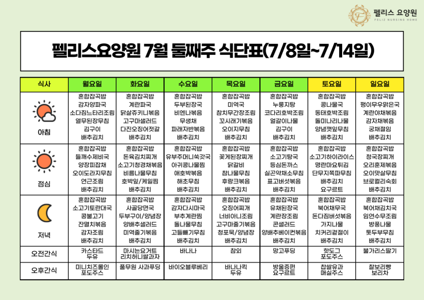 펠리스요양원 7월 둘째주 식단표 - 7/8~7/14 페이지 정보 작성자 관리자 댓글 0건 조회 80회 작성일 24-07-08 16:44 본문 펠리스요양원 7월 둘째주 식단표 - 7/8~7/14 목록 목록 이전글펠리스요양원 7월 셋째주 식단표 - 7/15~7/21 24.07.19 다음글펠리스요양원 7월 첫째주 식단표 - 7/1~7/7 24.07.02