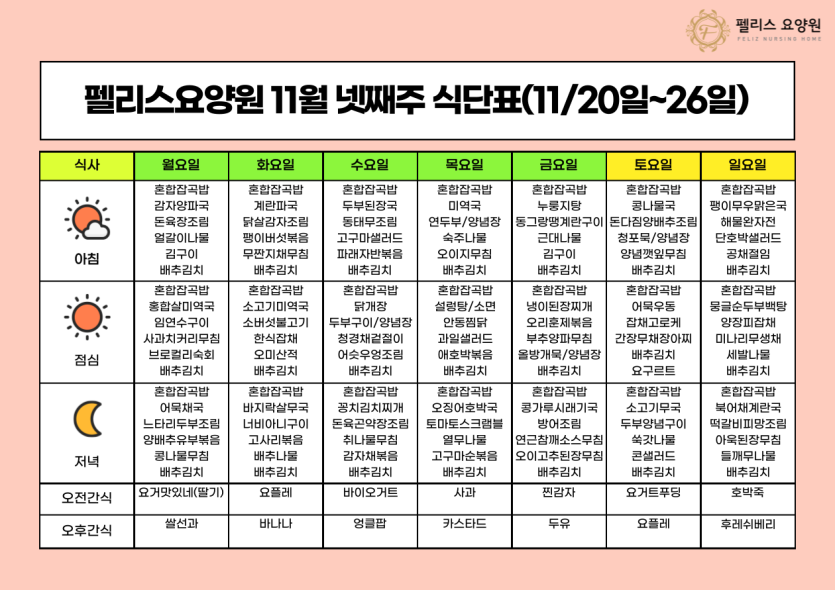 펠리스요양원 11월 넷째주 식단표 - 11/20~11/26 페이지 정보 작성자 관리자 댓글 0건 조회 79회 작성일 23-11-20 11:27 본문 펠리스요양원 11월 넷째주 식단표 - 11/20~11/26 목록 목록 이전글펠리스요양원 맛있는 한 끼 11월 편 23.11.24 다음글펠리스요양원 11월 셋째주 식단표 - 11/13~11/19 23.11.13