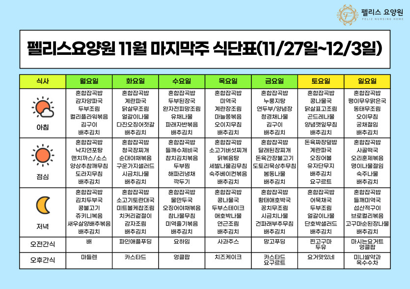 펠리스요양원 11월 마지막주 식단표 - 11/27~12/2 페이지 정보 작성자 관리자 댓글 0건 조회 81회 작성일 23-11-27 13:23 본문 펠리스요양원 11월 마지막주 식단표 - 11/27~12/2 목록 목록 이전글펠리스요양원 12월 첫째주 식단표 - 12/04~12/11 23.12.04 다음글펠리스요양원 맛있는 간식 11월 편 23.11.24