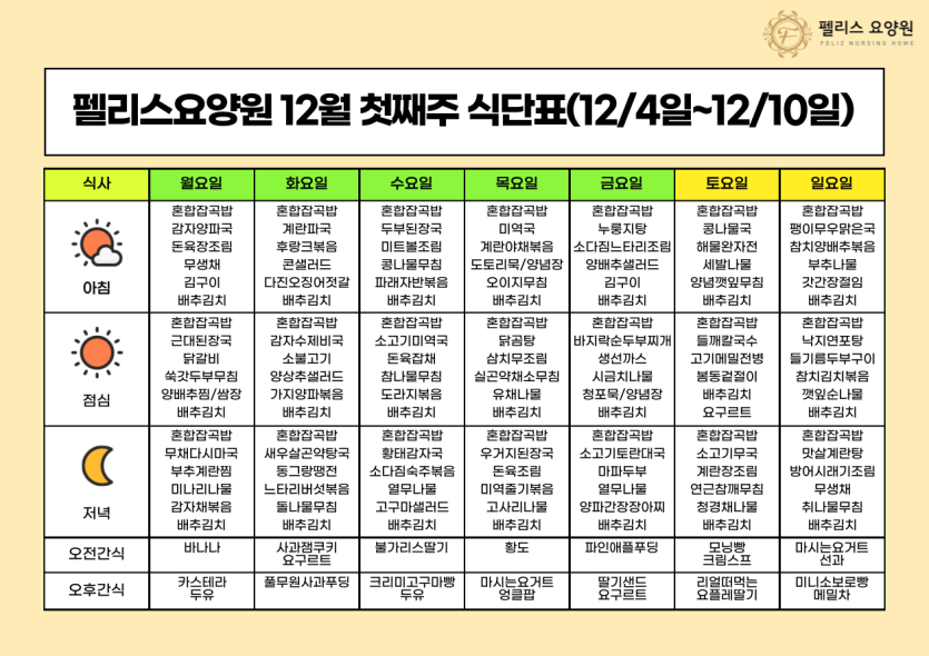 펠리스요양원 12월 첫째주 식단표 - 12/04~12/11 페이지 정보 작성자 관리자 댓글 0건 조회 91회 작성일 23-12-04 13:05 본문 펠리스요양원 12월 첫째주 식단표 - 12/04~12/11 목록 목록 이전글펠리스요양원 12월 둘째주 식단표 - 12/11~12/17 23.12.08 다음글펠리스요양원 11월 마지막주 식단표 - 11/27~12/2 23.11.27