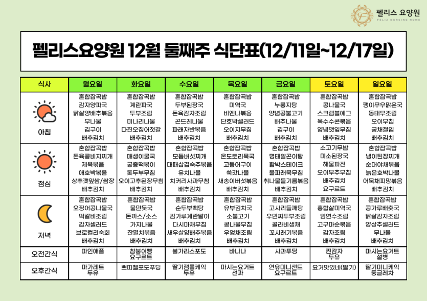 펠리스요양원 12월 둘째주 식단표 - 12/11~12/17 페이지 정보 작성자 관리자 댓글 0건 조회 86회 작성일 23-12-08 15:41 본문 펠리스요양원 12월 둘째주 식단표 - 12/11~12/17 목록 목록 이전글펠리스요양원 12월 셋째주 식단표 - 12/18~12/24 23.12.18 다음글펠리스요양원 12월 첫째주 식단표 - 12/04~12/11 23.12.04