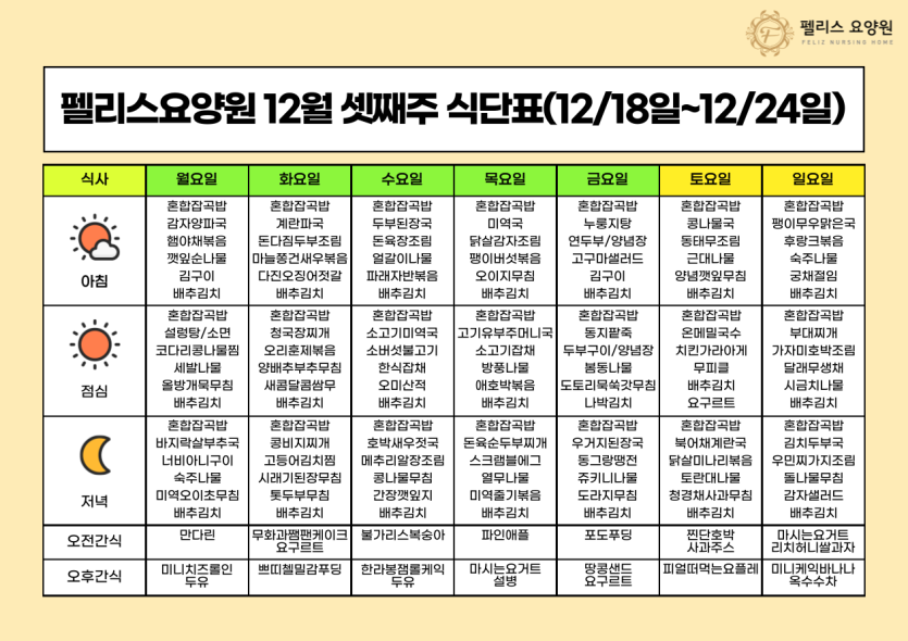 펠리스요양원 12월 셋째주 식단표 - 12/18~12/24 페이지 정보 작성자 관리자 댓글 0건 조회 87회 작성일 23-12-18 10:33 본문 펠리스요양원 12월 셋째주 식단표 - 12/18~12/24 목록 목록 이전글펠리스요양원 12월 마지막주 식단표 - 12/25~12/31 23.12.27 다음글펠리스요양원 12월 둘째주 식단표 - 12/11~12/17 23.12.08