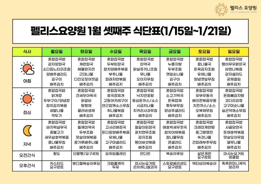 펠리스요양원 1월 셋째주 식단표 - 1/15~1/21 페이지 정보 작성자 관리자 댓글 0건 조회 81회 작성일 24-01-15 12:00 본문 펠리스요양원 1월 셋째주 식단표 - 1/15~1/21 목록 목록 이전글펠리스요양원 1월 넷째주 식단표 - 1/22~1/28 24.01.22 다음글펠리스요양원 1월 둘째주 식단표 - 1/8~1/14 24.01.08