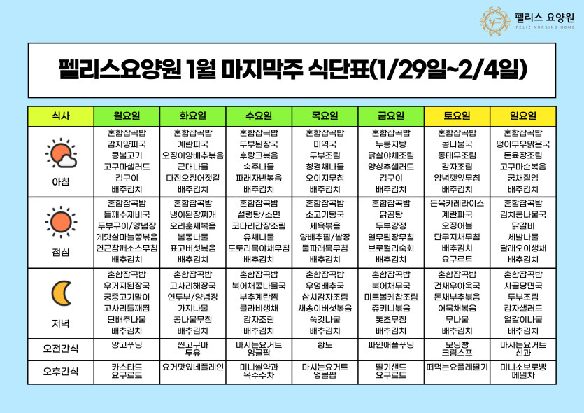 펠리스요양원 1월 넷째주 식단표 - 1/29~2/4 페이지 정보 작성자 관리자 댓글 0건 조회 81회 작성일 24-01-29 13:15 본문 펠리스요양원 1월 넷째주 식단표 - 1/29~2/4 목록 목록 이전글펠리스요양원 맛있는 한 끼 1월 편 24.02.05 다음글펠리스요양원 1월 넷째주 식단표 - 1/22~1/28 24.01.22