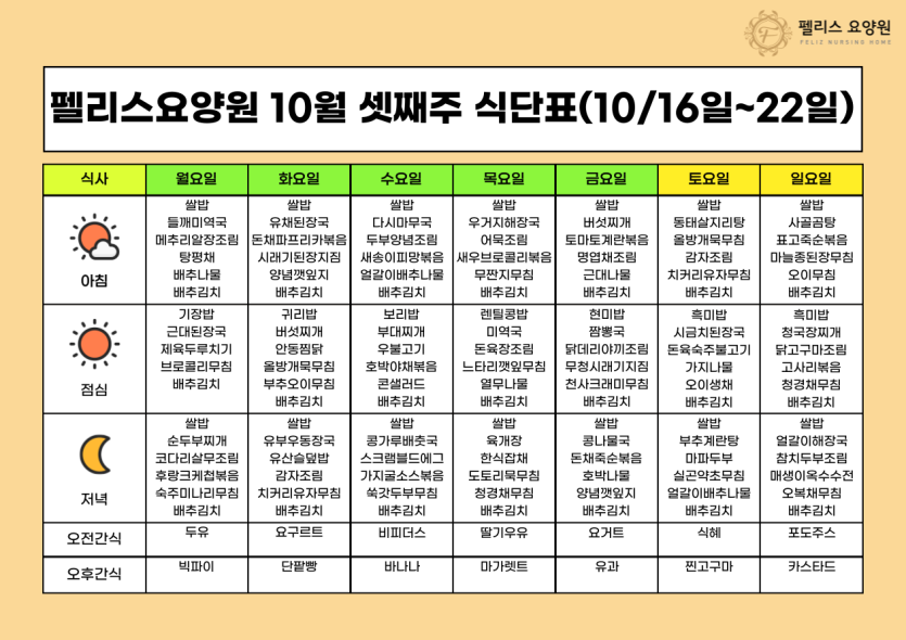 펠리스요양원 10월 셋째주 식단표 - 10/16~10/22 페이지 정보 작성자 관리자 댓글 0건 조회 84회 작성일 23-10-16 13:12 본문 펠리스요양원 10월 셋째주 식단표 - 10/16~10/22 목록 목록 이전글펠리스요양원 10월 넷째주 식단표 - 10/23~10/29 23.10.23 다음글펠리스요양원 10월 둘째주 식단표 - 10/09~10/15 23.10.10