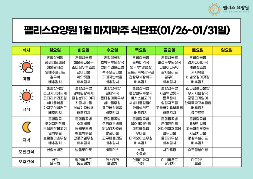 펠리스요양원 1월 넷째주 식단표 - 01/26~01/31 페이지 정보 작성자 관리자 댓글 0건 조회 1회 작성일 26-01-27 13:32 본문 펠리스요양원 1월 넷째주 식단표 - 01/26~01/31 목록 목록 다음글펠리스요양원 1월 셋째주 식단표 - 01/19~01/25 26.01.20