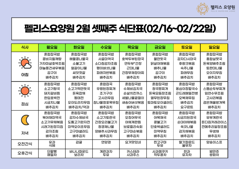 펠리스요양원2월 셋째주 식단표 - 02/16~02/22 페이지 정보 작성자 관리자 댓글 0건 조회 17회 작성일 26-02-21 13:31 본문 펠리스요양원2월 셋째주 식단표 - 02/16~02/22 목록 목록 이전글펠리스요양원2월 마지막주 식단표 - 02/23~02/28 26.03.06 다음글펠리스요양원2월 둘째주 식단표 - 02/09~02/15 26.02.09