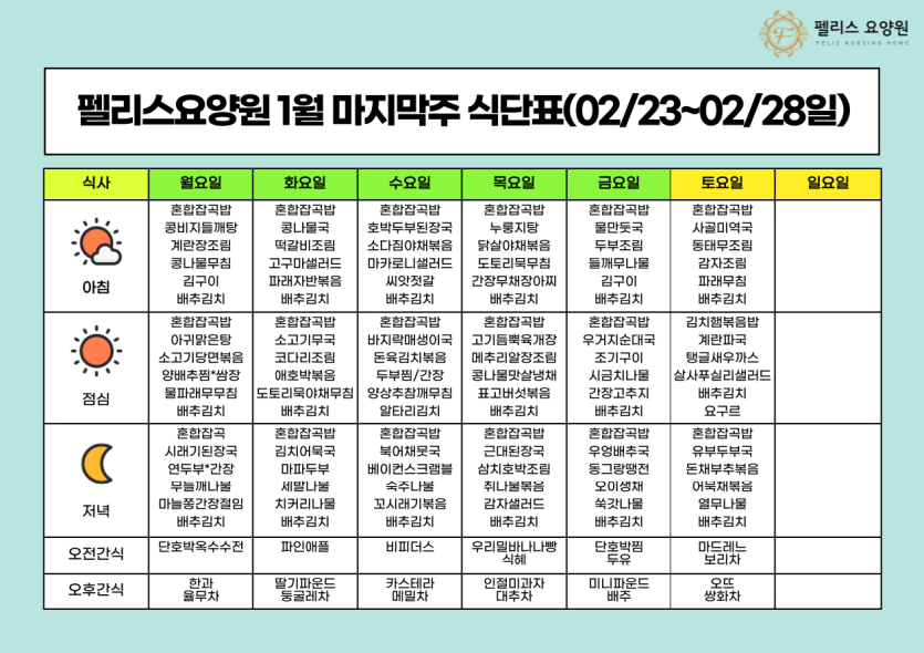 펠리스요양원2월 마지막주 식단표 - 02/23~02/28 페이지 정보 작성자 관리자 댓글 0건 조회 1회 작성일 26-03-06 17:57 본문 펠리스요양원2월 마지막주 식단표 - 02/23~02/28 목록 목록 다음글펠리스요양원2월 셋째주 식단표 - 02/16~02/22 26.02.21